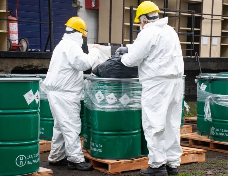 Disposición de recipientes contaminados (descontaminado, trozado y/o compactado).